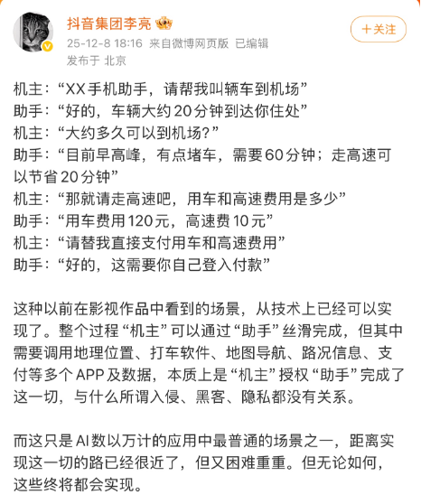 12月9日,抖音副总裁李亮发微博谈及豆包与中兴合作推出的AI手机助手。李亮认为,AI带来的变革是真实存在的,用户需求也是真实存在的,豆包和中兴的探索是一个开始。此前一天,李亮以打车场景举例,介绍了当前手机在实现复杂需求时的自动化操作。他强调,该功能的本质是机主授权助手完成操作,属于合法合规的数据使用范畴。