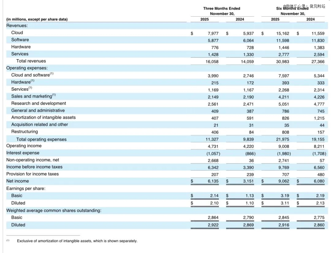 财报显示,2026财年第二财季,甲骨文实现营收160.6亿美元,同比增长14%,低于分析师预期的162.1亿美元;通用会计准则(GAAP)净利润为61亿美元;非通用会计准则下净利润为67亿美元,同比增长57%;通用会计准则每股收益为2.1美元,同比增长91%。